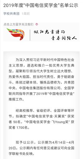 “中国电信奖学金”遴选寻访活动自2014年启动以来,得到全国高校的广泛关注和青年学生的积极参与。该活动旨在深入遴选和推介一批优秀青年学生典型,凝聚和引领广大青年学生树立远大理想、热爱伟大祖国、担当时代责任、勇于砥砺奋斗、练就过硬本领、锤炼品德修为,为实现中国梦不懈奋斗。2019年全国共有1700名同学获得“中国电信奖学金·飞Young奖”。
