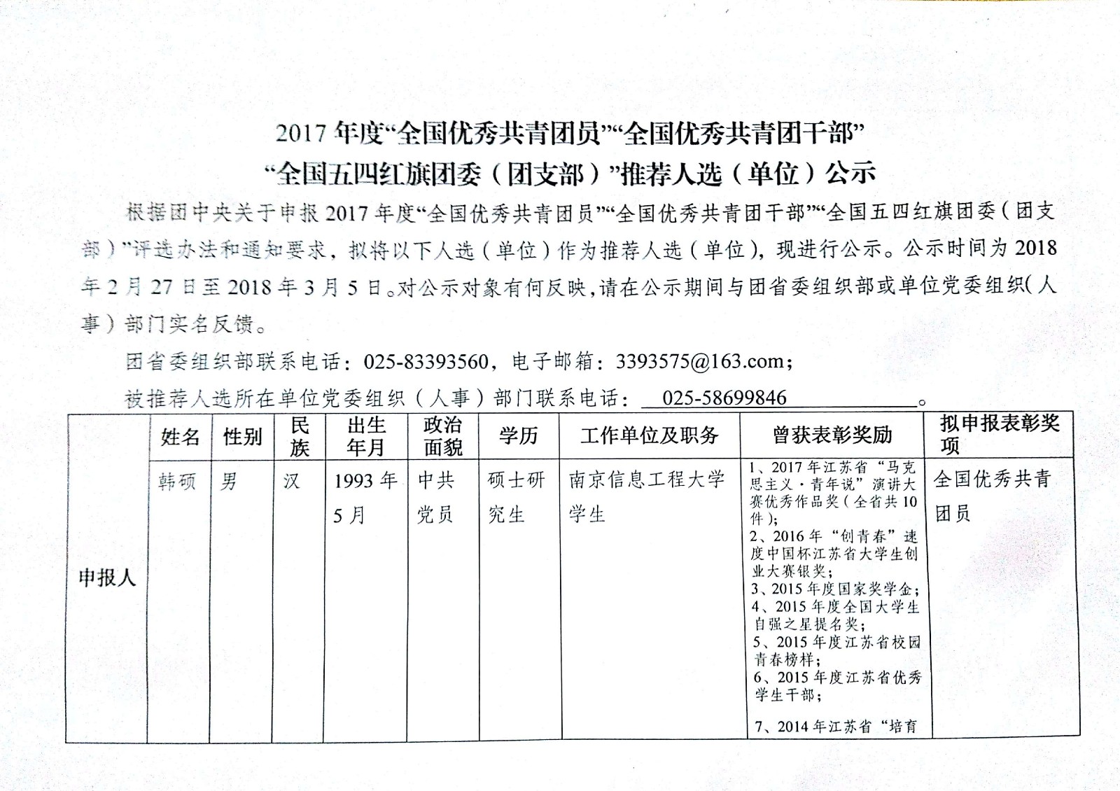 【通知公告】2017年度“全国优秀共青团员”“全国优秀共青团干部” “全国五四红旗团委(团支部)”推荐人选(单位)公示