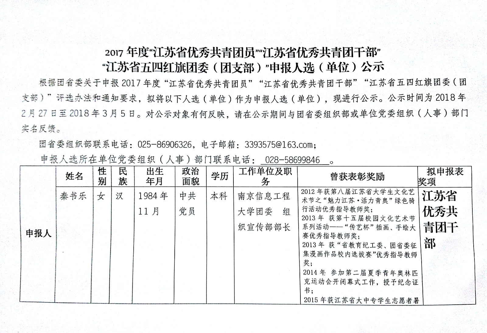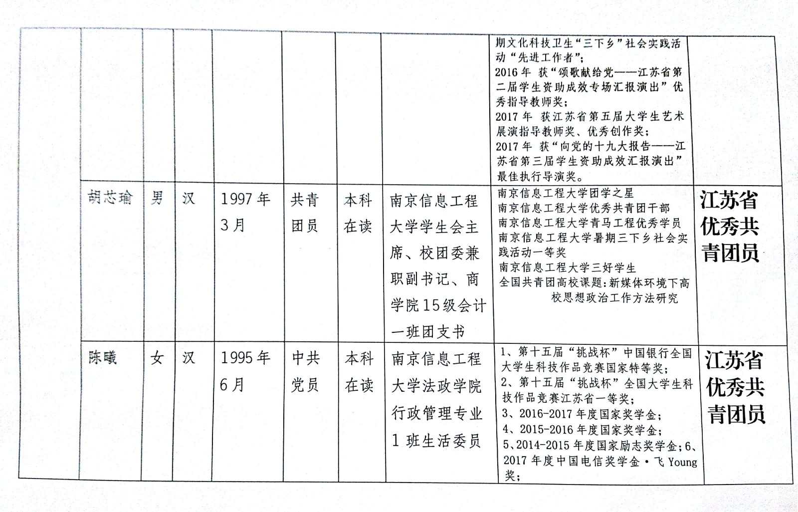 【通知公告】2017年度“江苏省优秀共青团员”“江苏省优秀共青团干部” “江苏省五四红旗团委(团支部)”申报人选(单位)公示